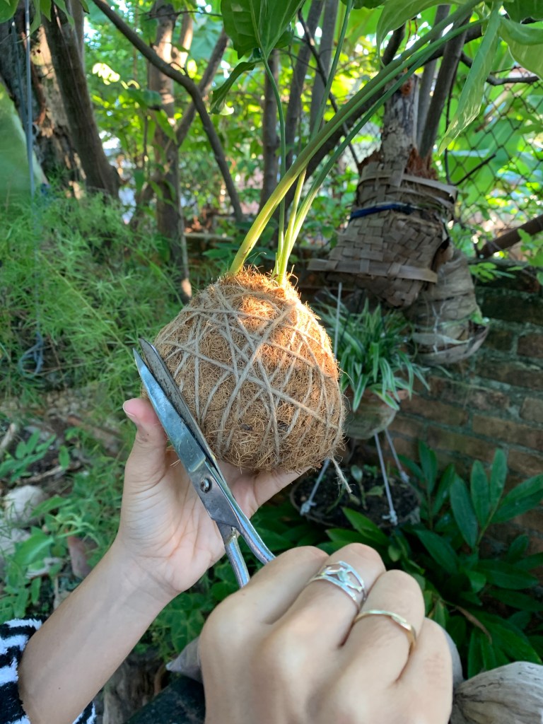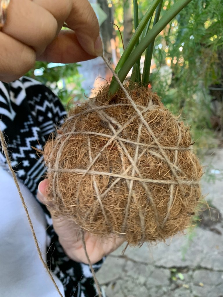 Kokedama proviene del japonés y significa «bola de musgo», y para adaptarlas a la realidad de nuestro archipiélago usamos fibra de coco en el exterior en vez de musgo. La fibra de coco provee a la planta de una protección natural, que contribuye a mantener la humedad y sostener la tierra.